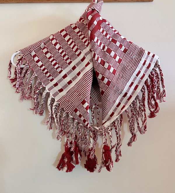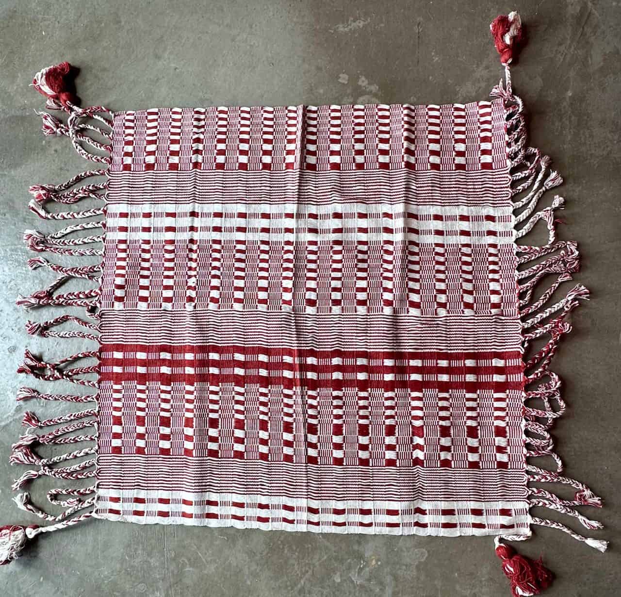 This triangular neck scarf, aka bandana or kerchief, is 23” square when open. It has lots of hand-tied fringes and tassels at each corner long enough for tying the scarf closed around the neck. It is woven on a backstrap loom in Zinacantan, Chiapas of 100% cotton. A fashion addition to your dressing and can keep your neck comfy cozy, too. The open weave adds interest to the textile.