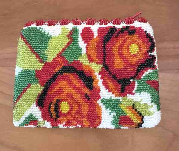 Densely beaded chakira coin purse, lined with zipper closure, made on the Oaxaca coast near Puerto Escondido, Jamiltepec. Nothing more to say but beautiful and functional. Don’t want to use it for change? Use it for make-up to carry with you. Red, green, white. Measures 5-1/2″ wide x 4-1/4″ high.