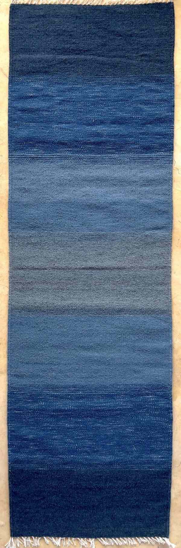 Description: hand woven rug. Color palette: three indigo shades and ikat technique.