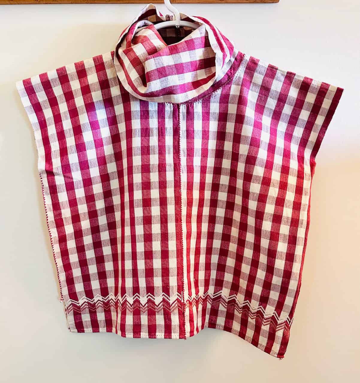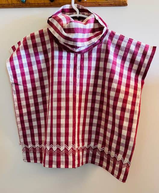 Cheery, cherry red check pullover top is ready for you to wear this spring. Transition into fall with long sleeve white Tee, too. Notice the zigzag white detail around the hem. This is achieved using the supplemental weft weaving technique while the cloth is on the loom. Seams are joined using the finest needlework, including the beautiful detail on the cowl. The photos say it all! Measures 24” wide by 22” long.