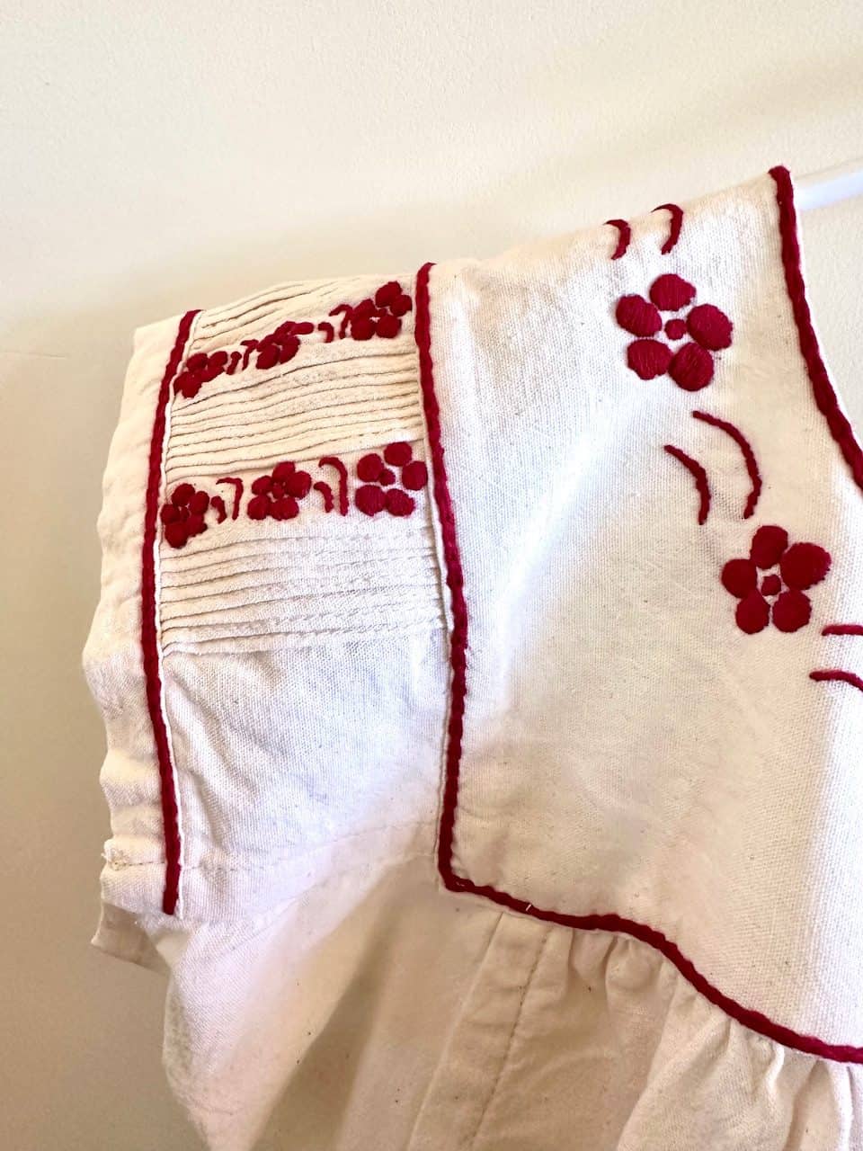 A perfect fun blouse for summer with hand embroidered true red flowers, and smocking on the sleeves. Handmade in Oaxaca’s Mixteca Alta. Notice the smocking! Easy comfort over jeans or a skirt. Manta cotton, more of a creamy white. Machine wash. Hang to dry. Measures 13-1/2” wide across floral bodice, 22” wide from armpit to armpit, and 25” long. I’d call this a size S.