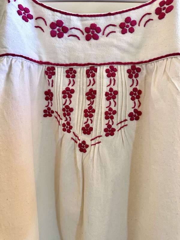 A perfect fun blouse for summer with hand embroidered with bright cherry red flowers, and smocking on the sleeves. Easy comfort over jeans or a skirt. Manta cotton, more of a creamy white. Machine wash. Hang to dry. Measures 14” wide across floral bodice, 22” wide from armpit to armpit, and 25” long. I’d call this a size S-M.