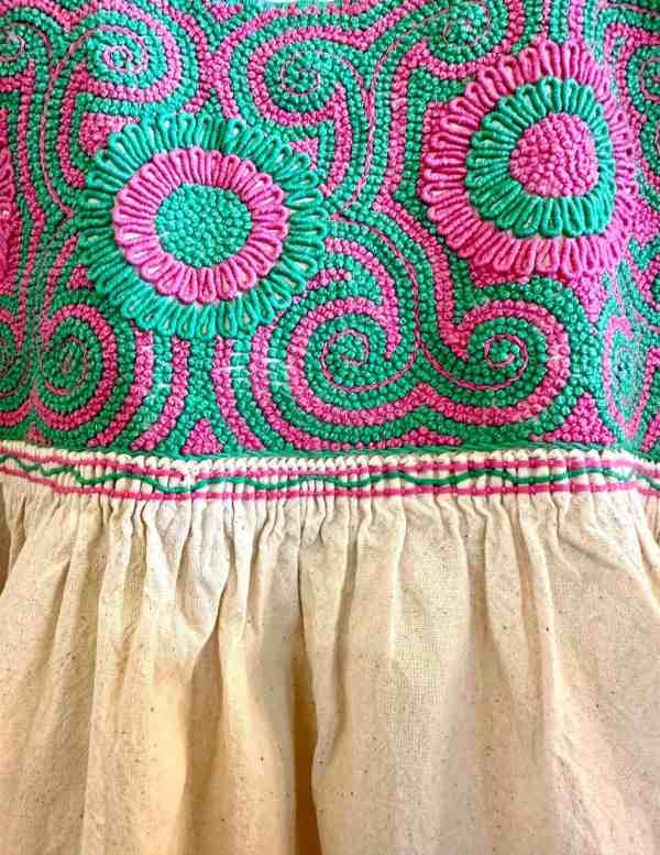 Just in from Chiapas, Mexico, this spring fresh 100% cotton blouse hand embroidered by Francisca with perfectly executed and dense French knots. It takes her three weeks to make each blouse! Each stitch in this garment is impeccably made by hand. The bodice is gather with smocking, as are the short sleeves, exactly what you need for spring and summer. Size Medium. Measures 13” wide across the embroidered part of the bodice, 25” wide armpit to armpit, and 28” long. Machine was gentle, hang to dry.