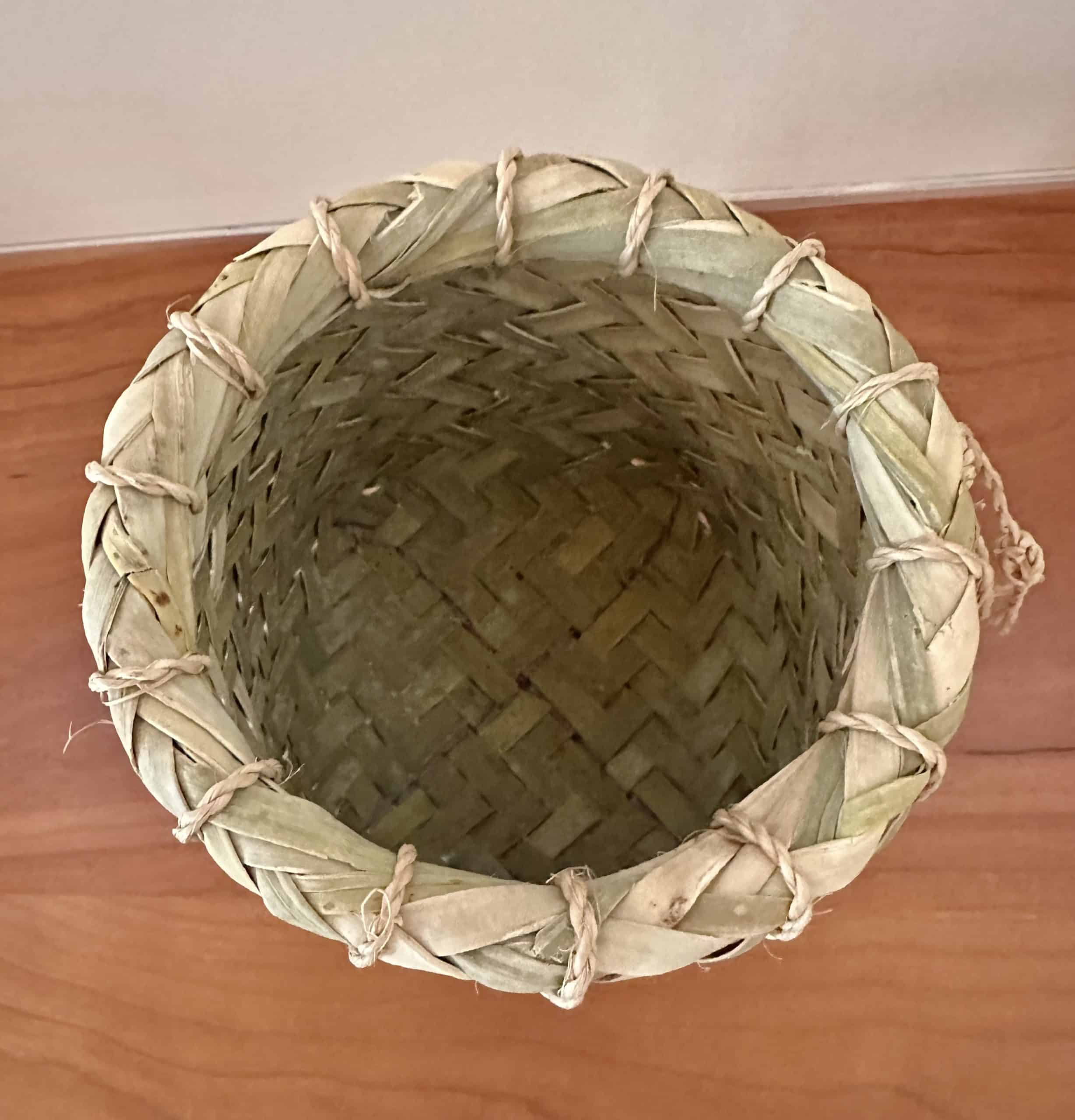 Small and beautiful, this natural palm basket handwoven in Oaxaca’s Mixteca Alta can be used in kitchen or bathrooms or even on your bedside table. Use it to store creams and lotions, cotton balls or wipes, and even small kitchen utensils. Elegantly practical. Sturdy, rigid sides. Braided palm cord, too, if you want to hang it from a hook. Measures 5” diameter x 6” tall.
